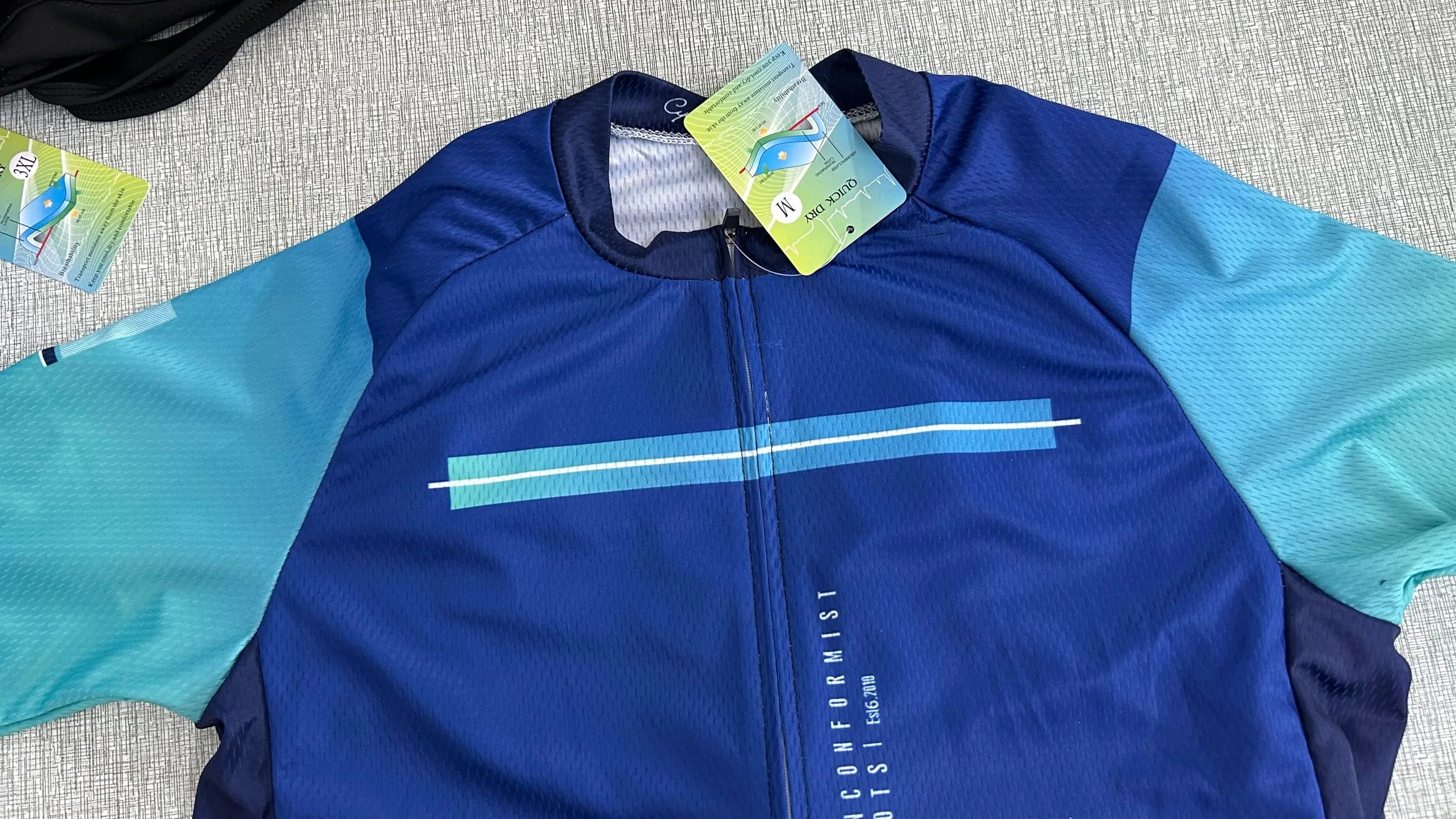 Material: jerseys (100% polyester), bib shorts (80% polyester & 20% lycra)